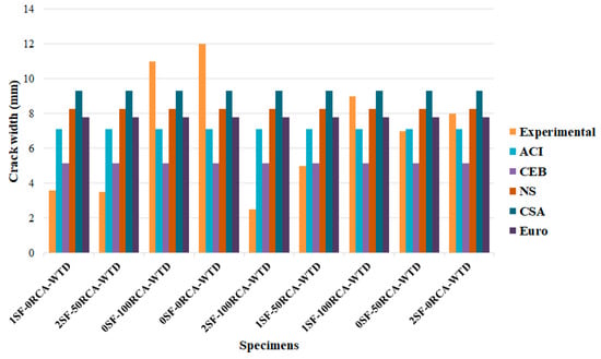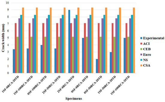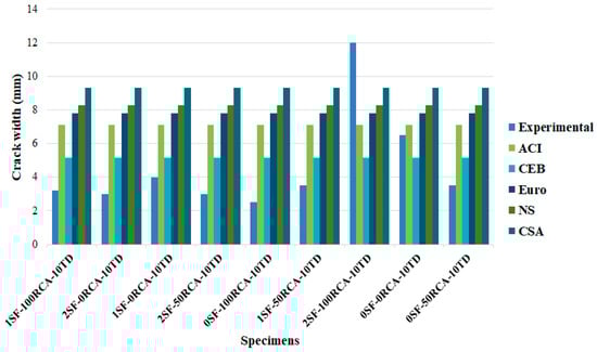 A short-term literature review indicated that many types of studies have been done to evaluate the crack spacing and width in RC beams. According to previous studies, crack spacing is slightly reduced by increasing the SF content. Alternatively, SFs can enhance the bending and shear behaviour of concrete beams [58,59,60] but the impact of RCA on the flexural and shear crack width and propagation has not been studied. Therefore, in this study, the influence of RCA and SF on the compressive and tensile strength of concrete was evaluated because the compressive and tensile strengths of concrete influence the flexural and shear strength of RC beams. This issue could also be observed in models proposed by several standards. Then, the influence of SFs on the crack spacing of RC beams manufactured using different values of RCA and NCA, as well as of the shear rebar’s spacing, was analysed. The main objective was to control the cracking and their propagation in RC beams when RCA was used, which is an important factor in the failure mode of RC beams and the corrosion potential of rebars. After the evaluation of cracking and their width in experimental specimens, the results were compared with those from numerical models proposed by several standards to show the ability of codes to predict crack widths when RCA and SFs are used.