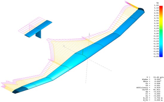 HALE solar aircrafts that have been developed so far have average cruising speeds of 15~30 m/s and perform missions in low Reynolds number range. The DAEs airfoil has an excellent max lift coefficient, lift to drag ratio, and large thickness ratio in low Reynolds number range. Moreover, the HALE solar aircraft wing characteristic of being less sensitive to airfoil surface accuracy makes it easier to produce by applying solar panels. For these reasons, DAE-11 was selected as the airfoil of the main wing in this study. With respect to the DAE-11 airfoil, 2-dimensional aerodynamic data were produced using XFLR5 [14] and, based on these data, the lift and drag coefficients of a finite wing (3 dimensional) were calculated. The lift coefficient () can be calculated from Equation (2):