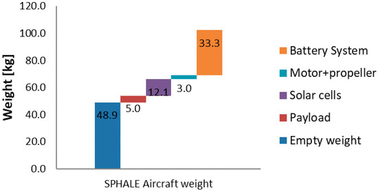 When the configuration of the referenced Zephyr S is applied, estimated weights of structure, payload, solar cell, motor and propeller, and battery are shown in Table 4. Payload was set to 5 kg, which is the payload value of Zephyr S, and motor and propeller is assumed to be 3 kg. Figure 5 shows the weight breakdown of a reference HALE solar aircraft.