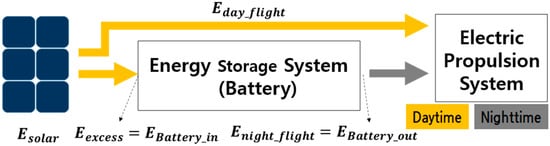 Solar energy procured during the daytime () is used for flight energy required for daytime flight () and remaining excess solar energy () is stored in the battery.