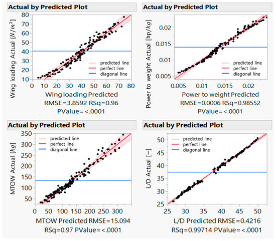 In this study, the smaller-the-better (STB) optimization was used to optimize the design objective parameters, wing loading, power to weight, maximum take-off weight defined in Table 5. Lift to drag ratio was optimized using the larger-the-better (LTB) optimization through JMP “desirability function.” In Figure 19, the x-axis represents the independent design variables and the y-axis represents the response variables. The desirability characteristic is presented by the slope on the right. The smaller-the-better (STB) has a negative slope whereas the larger-the-better (LTB) has a positive slope.