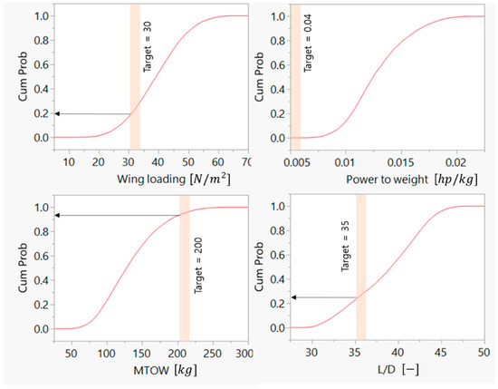 Figure 18 provides graphs of the percentages according to the designable ranges of the design objective parameters. The horizontal axis provides the design objective parameter values produced in the Monte Carlo simulation; the vertical axis shows the percentages representing feasibility. For instance, in the case of wing loading, the targeted value is 30 ; thus, accordingly, the design probability is found to be 20% on the vertical axis. As for the maximum take-off weight, its target value is 200 kg, and, the design probability is 92.4% along the vertical axis. In this manner, it is found that these values are the same as the design probability values analyzed in the percentile table above.
