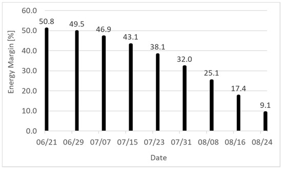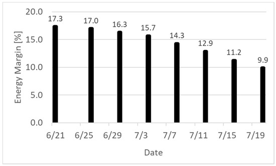 We also analyzed how many days long-endurance is possible during the summer (6/21) as shown in Figure 22. The energy margin over 10% was assumed and on 5/24 and 7/19, the energy margin was 9.9%. Therefore, it was shown that the reference aircraft could fly for a total of 56 days, from 5/24 to 7/18.