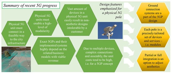 Clearly, the modularity of devices plays a role in the prospective design of services per 5GP site. The modularity is also a tool to handle the cost structure per type of site and at individual 5GPs. The integration of a 5GP requires connections to data, power and possibly cooling network of the city or suburb. The development of design tools combining the wireless network and city planning is essential and is a significant design phase in the future. A sophisticated smart pole, a 5GP, can be considered as aesthetically fitted integrated structure, which embodies various devices including the radios within the main structure of the pole.