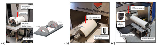 Testing of GFRP mechanics: (a) the QS indentation of a half-circular specimen with a semi-rigid boundary; (b) the drop-weight impact testing of a half-circular specimen with an ‘open’ boundary, and; (c) the drop-weight impact testing of a tubular pole specimen.