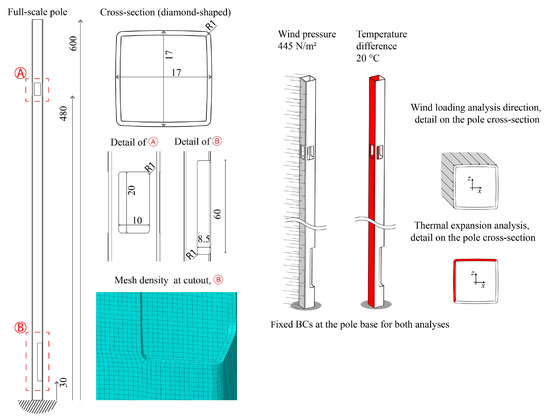 For most of the composite materials, the thermal expansions are lower than those for any steel alloy. Thermal expansion coefficients of fibrous composites depends on the applied constituent materials and the lay-up of reinforcement, along with many factors of measurements [29,30]. In this study, the linear thermal expansion coefficients (CTEs) of the GFRP composite were determined using an experimental arrangement and an iterative FEA of the CTE values based on the residual strain, as described in Section 2.4 and Appendix A. The boundary conditions and loads (wind load distribution), shown in Figure 4, reflect a standard specification [31]. The wind loads represent the primary mechanical load against which the pole structure must be verified. The wind reference speed is given by the standard, e.g., here it is 21 m/s for the terrain category II of Scandinavia. The services for positioning systems are typically well balanced for pole sway yet device-specific performance can set a limit for the maximum allowed shaft bending. In this study, car-crash performance was not evaluated but impact-type loads subjected to the pole shaft were deemed an important local failure type.