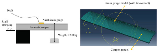 The finite element model assembly consisted of a coupon model and a gauge model. The composite was modelled using the material constants in Table 1. Because a solid element type (C3D8R) was used, a cylindrical material coordinate system was set so that the radial direction corresponded to the ABAQUS axis nomination ‘1’, the perimeter direction to the nomination ‘2’ and the axial direction to the nomination ‘3’. The gauge was modelled as a strip of isotropic polyimide (Kapton®) with a Young’s modulus value of 4.0 GPa and Poisson’s ratio of 0.3 [32]. A CTE value of 1.17 × 10−5 1/°C was used for the gauge based on the adoptable thermal expansion given by the manufacturer (i.e., the gauge follows corresponding expansion in terms of strain reading (zero)). The gauge was meshed by using parabolic (C3D20R) elements. The gauge model was attached to the coupon model by so-called tie-constraints. The model was run by a point load and thermal field ( °C) in two steps.