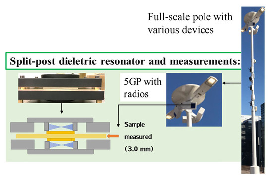 The sections of 5GPs that provide the needed weather protection to the (5G) radios, are typically referred to as ‘radomes’. Low-attenuation and low-permittivity materials are an especial family of polymers that could be employed for the radomes. Radomes mainly protect against moisture and ultraviolet (UV) radiation (e.g., the reference standard UL 746C), as illustrated in Figure 6. The selected material samples’ attenuation was measured by using a split-post dielectric resonator (SPDR) at 2.45 GHz (QWED, Warsaw, Poland) with a Microwave Frequency Q-Meter (QWED, Warsaw, Poland). The sample size was 60 mm × 60 mm (thickness 2.5–3.0 mm). The measurements were made at a constant signal frequency of 2.45 GHz and sample-specific thickness was measured to determine attenuation. An especial polymer blend (PREPERM, Premix, Finland) was selected as a candidate material for these details of the pole.