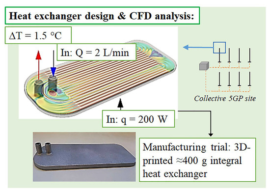 - Entirely integral one-piece heat exchangers were designed with CFD analysis of the fluid-solid interaction for heat transfer, and printed. It was found that a parallel liquid cooling of four radio units is rather insensitive to the flow rate (range 2…6 L/min) and as high as ≈60 °C inlet temperature can be allowed to keep the device surfaces at or below a critical 65 °C.