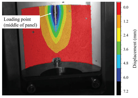 The mechanical testing of a panel specimen: the DIC-resolved displacement field during the indentation loading of the half-circular specimen at the moment of maximum load.