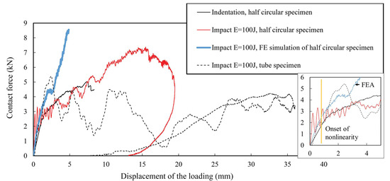 The contact force versus displacement of the loading head was defined for different loading configurations during the testing campaign (see Figure 9). The results show clearly the effects of specimen size and support on the load response. For the similar size half-circular specimen, the trend of the loading in the QS indentation and drop-weigh impact is essentially similar regardless of the difference in the support (semi-rigid or open boundary). However, when comparing the impact response of the tubular specimen to the half-circular panel, the indentation and impact cases showed clear differences in terms of maximum load and ultimate deflection. Figure 9 also includes local FEA of the GFRP panel (failure criteria applied) [27]. It was confirmed, as is typical for composites, that the load-carrying capability after the damage onset remains. The first failure mode due to the impact was internal delamination and often visible crack in the axial direction of the shaft.