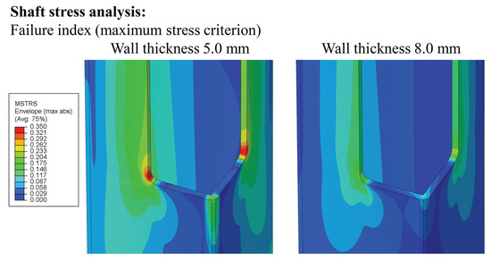 FEA for the failure index when comparing two different pole shaft laminates and a diamond-shaped cross-section (5 mm and 8 mm-wall thickness); corners (hotspot) at a root cutout are shown.
