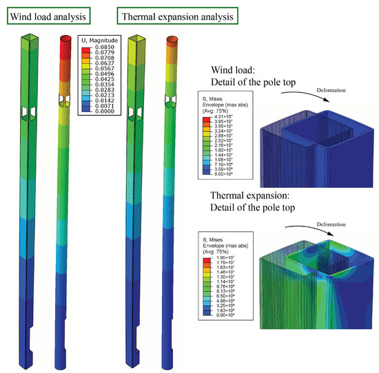 FEA for the deformation when the pole shaft is subjected to the standard wind load (left side image) and a thermal load (right side image). Details of the highest deformation (pole top) are shown on the right.