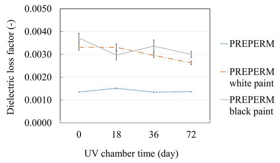 Any enclosing of the (5G) radios inside a housing or shaft requires analyzing the RF signal attenuation due to the surrounding enclosure or radome wall. The design of the details, i.e., radomes or ‘signal windows’ in cutouts, must satisfy experimental verification regarding the attenuation. In this study, the radomes were designed not be load-carrying parts so that reinforcements (fibers) were not needed for the radomes. PREPERM polymer (see Section 2.5) was analyzed here, and attenuation defined in terms of dielectric loss (DL). In particular, the long-term properties of the radome materials in outdoor environments were not well-known. Therefore, the effects of UV radiation (from the sun) were considered in this study. In reality, the signal windows might need to be painted that makes the measurements with painted samples necessary. According to the measurement results, shown in Figure 12, the minimum paint design is crucial for a high signal penetration. The effect of a paint layer had a significant impact on the signal attenuation (i.e., dielectric loss (DL)) and the treatment increased the DL levels 90–175%. Slightly lower increase was measured as the UV degradation was increased (longer UV exposure time); the color of the paint did not observably affect the attenuation.