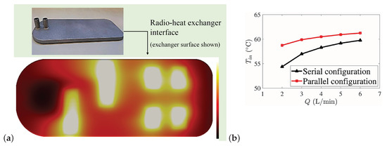 Based on the results, the walls could be made thinner (e.g., 1 mm) to result in a less than 200 g mass of the exchanger while the tested exchanger version (wall thickness 2 mm) had a ≈393 g mass. It was confirmed by simulations that the system can maintain surface temperatures below 65 °C for a range of mass flow rates for cooling water’s inflow temperature below 50 °C (see Figure 13). Figure 13b shows the inlet temperature of the cooling water as a function of the mass flow rate that maintains the heat exchangers’ heated surface temperatures at 65 °C. The serial and parallel configurations indicate whether the heat exchangers (inside) of the 5GP would be connected in series or in parallel to cool all the four radios. The highest allowed inlet water temperature for the serial and parallel configurations of liquid cooling heat exchanger is based on the assumption that the temperature difference between the inlet water and the heated surface is independent of the absolute temperature—based on the mass flow rate sensitivity analysis that has confirmed the independency of transfer performance on the inlet Reynolds number [33]. Furthermore, the functionality of the heat exchanger was tested experimentally, and the measured surface temperatures were in a good agreement with the CFD results.