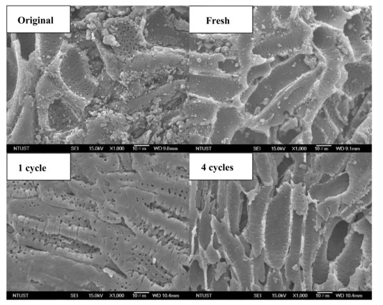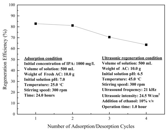 In this study, it was determined that the optimal operating conditions were an ultrasonic intensity of 24.5 W/cm2, a solution temperature of 45 °C and an ethanol concentration of 10% (v/v), with a regeneration efficiency of 82.9%. In comparison, Horng and Tseng employed photocatalytic degradation to regenerate IPA-loaded activated carbon and found that, by measuring IPA residue, >99% of adsorbed IPA was destructed. While initial adsorption capacity was at 90 mg/g, this had dropped to 87 mg/g after one regeneration, a regeneration of over 96% [28]. In tests with other organic solvents, ultrasonic regeneration was found to regenerate 70% of phenol [12] and 64% of trichloroethylene [15] which is lower than the 82% found in this study. The optimal operating conditions were tested in multiple consecutive cycles. Figure 8 shows the reuse potential of regenerated activated carbon over four cycles of adsorption and desorption. The regeneration efficiency gradually decreased from 83% after the first cycle to 81%, 71% and 64% after the second, third and fourth cycles, respectively. In comparison, Horn and Tseng demonstrated that, with their decomposition technique, higher regenerations were achieved of 96% after one regeneration to about 94% after 3 regeneration cycles. While this is a high regeneration of activated carbon, the IPA is destroyed, preventing reuse [28]. This decrease can be attributed to different causes, such as gradual blocking of the porous structure as adsorbate is not completely removed during regeneration. Reduced particle size and increased weight loss of regenerated activated carbon were observed after repeated applications in this study, which is also likely to cause a decrease in adsorption efficiency. A scanning electron microscope (SEM) was used to identify the effect of ultrasound on the morphology of the activated carbon surface. As revealed in Figure 2, SEM images of the original and regenerated activated carbon demonstrated similar surface morphologies before and after ultrasonic regeneration, showing no significant deviation after four operation cycles. The pore structure characteristics of the fresh and regenerated activated carbon over these cycles are presented in Table 2. The results showed that the micropore volume, surface area and total pore volume of regenerated carbon were slightly decreased after four adsorption-desorption cycles. This change in surface morphology is likely another reason for the decreased regeneration efficiency.