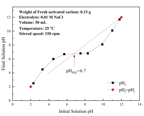 Analysis of surface elements was performed on original (before the acid ash) and fresh (after the acid ash) activated carbon, with the results shown in Table 1. The contaminants of activated carbon were significantly removed by acid washing, as shown by the increased carbon content. As revealed in Figure 2, SEM imaging also revealed that acid washing removed impurities, giving rise to a pore structure with a seemingly smoother surface. The pore structure characteristics of the original activated carbon and fresh activated carbon are presented in Table 2. Fresh activated carbon exhibited a slightly larger specific surface area and total pore volume compared to original activated carbon; this may be an effect of other chemicals, such as oxygen, being removed during the acid washing process. However, the acid washing seems to have little effect on the pore size of activated carbon. The mean pore diameters of the original and fresh activated carbon indicate that a vast majority of the pores fall into the range of micropores. The point of zero charge, which is the pH at which the net surface charge is zero, of fresh activated carbon was found to be about 6.7, as revealed in Figure 3. The surface charge of activated carbon depends on the solution pH and its point of zero charge, the activated carbon surface is positively-charged at pH lower than the point of zero charge and vice versa [26]. Surface functional groups on activated carbon affect the surface charges and adsorption properties of activated carbon. Boehm titration of fresh activated carbon revealed that most of the acidic functional groups are lactone and phenolic groups, followed by the carboxylic group. The total number of the basic functional groups was calculated to be 0.207 mmol/g, which is approximately equal to the total number of acidic functional groups, confirming the previously observed point of zero charge of 6.7.