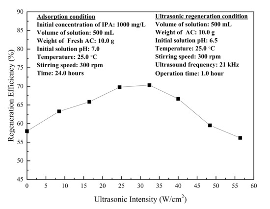 Effect of ultrasonic intensity on the regeneration efficiency of exhausted activated carbon.