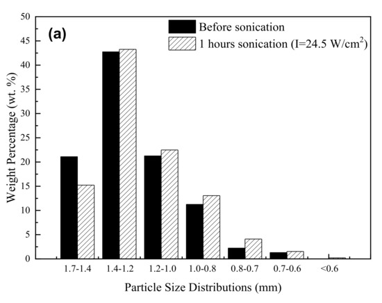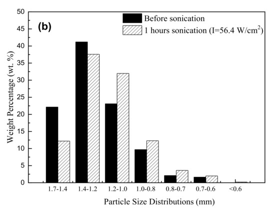 Particle size distributions of activated carbon before and after sonication at 24.5 W/cm2 (a) and 56.4 W/cm2 (b) for 1.0 h.