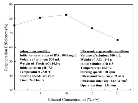 The effect of ethanol addition on the regeneration efficiency from IPA-saturated activated carbon is shown in Figure 7. The regeneration efficiency of activated carbon is higher for experiments conducted with the addition of 5 and 10% (v/v) ethanol. This can be explained due to the decreased tensile stress of aqueous solution by the presence of ethanol. In this study, the optimum ethanol concentration for ultrasonic regeneration of saturated activated carbon was 10% (v/v), at which the regeneration efficiency was 83%. However, the regeneration efficiency was decreased for ultrasonic desorption with ethanol concentrations of 15% and 20% (v/v), which may be due to a lowering of the cavitation threshold. This causes cavitation bubbles to coalesce into larger and more stable bubbles, thus decreasing the regeneration efficiency [21].
