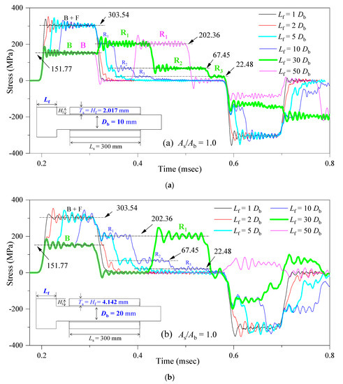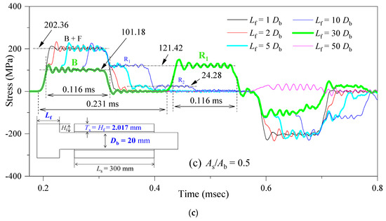To estimate the proportions of the B and F waves in the impact-generated stress magnitude, the plateau heights of the B wave in the green curves (Lf = 30Db) in Figure 4 are used as a reference (at this point in this discussion, the numbers marked for the plateau of the B wave are unknown; they are marked in the latter part of this paragraph). In Figure 4, the plateau heights of the B waves appear to be approximately half of the first tensile pulse when Lf = Db. Based on this observation, the impact-generated stress by the striker—the magnitude of which can be calculated using Equation (4)—is hypothesised to be equally divided between the B and F waves. Under this assumption, the calculated magnitudes of the B and F waves are 151.77 (As/Ab = 1.0; Figure 4b) and 101.18 MPa (As/Ab = 0.5; Figure 4c), respectively. The calculated half-magnitudes based on this hypothesis are marked on the first pulse (B wave) of the green curves (Lf = 30Db) using dash–dot horizontal lines. The vertical positions of the drawn lines are reasonably consistent with the plateau height of the first pulse (B wave), verifying the hypothesis that the impact-generated stress wave is equally divided between the B and F waves. This hypothesis is further verified below.