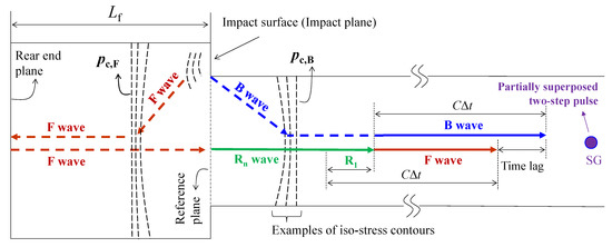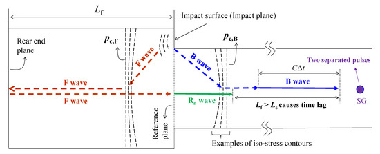 Next, the magnitudes of the B and Rn waves separated in the time axis are calculated. Note that in Figure 4, the B and F waves simultaneously form and propagate in opposite directions. To obtain the proportion at which the impact-generated stress separates into B and F waves, the overall magnitude of the impact-generated stress itself should first be determined. For this purpose, a one-dimensional equation [52] that was derived by considering the impact of a cylinder striker on a bar in the compression mode is employed: