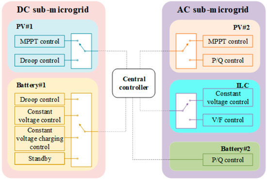 In the AC sub-microgrid, when connected to the grid, the AC side photovoltaic #2 needs to be controlled by MPPT as well as the DC side photovoltaic #1, and the AC side battery #2 can be control charging according to its constant power (P/Q). In isolated island, when the overall power consumption of the system is low, the AC side photovoltaic #2 and battery #2 can adopt P/Q control to achieve the supply and demand balance of AC side power and reduce the working frequency of the interlinking converter.