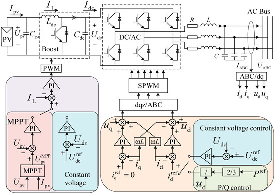 When MPPT is controlled, it may happen that the power generated by the system is greater than the maximum consumable power. In this paper, P/Q control is considered as an alternative control in the control of photovoltaic #2. The control strategy of photovoltaic power generation unit photovoltaic #2 on the AC side is shown in Figure 5.
