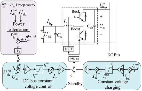 where, is the DC bus measurement voltage, is the DC bus reference voltage, is the measured output power of the DC side battery #1, is the reference output power of the DC side battery #1, is the voltage-power droop coefficient. When battery #1 is in rechargeable and dischargeable mode, , . When battery #1 can only be discharged, , .