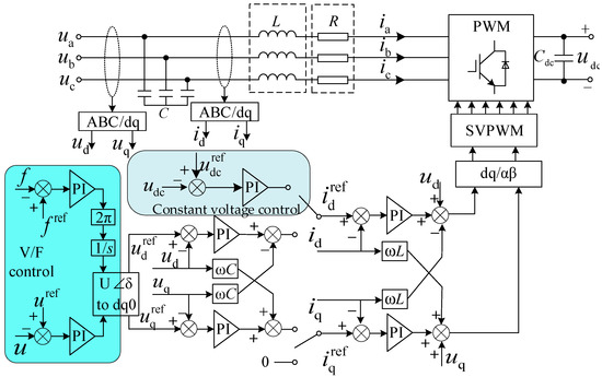 In this paper, the interlinking converter adopts different control strategies in grid-connected and island modes. When connected to the grid, the voltage and frequency of the AC bus are stable, so constant voltage control (unit power factor control) is adopted to maintain the DC bus voltage. In isolated island, V/F control is used to control and stabilize the voltage and frequency of the AC bus. The control strategy of a single interlinking converter in this paper is shown in Figure 10.