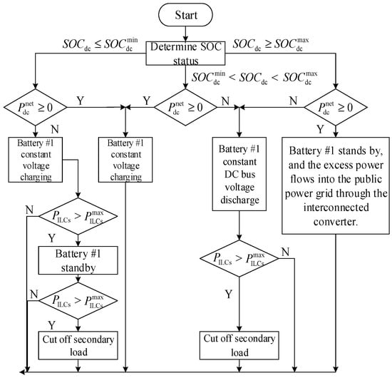 Although the DC side battery #1 is in constant voltage charging mode at this time, the power source is different. When , it means that although the battery power is low, the output power of the photovoltaic unit is sufficient to meet the demand of the DC load. Therefore, on the premise that the interlinking converter maintains the DC bus voltage, battery #1 can absorb the excess power generated by the photovoltaic unit at a constant voltage. When , the internal power supply of the DC sub-microgrid is scarce, but the capacity of the interlinking converter does not reach the rated value and battery #1 can still absorb power from the public grid in a constant voltage charging state. If , first put battery #1 in the standby state, and then continue to determine whether the interlinking converter is overloaded. If so, remove the DC load, otherwise, it will operate normally.