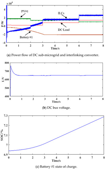 When the temperature is kept at 25 °C and the light intensity is kept at 1000 , the system is connected to the grid, and the DC side photovoltaic #1 and AC side photovoltaic #2 work in MPPT mode. The initial of DC side battery #1 is set to 95%. The initial conditions of AC side battery #2, interlinking converter, and AC load are the same as in case 1. At the initial moment of the system, the DC load power is 10 . At 3 s, the DC load power increases to 18 . At 6 s, the DC load continues to increase, and the power reaches 28 . According to the system setting, the charge state of DC side battery #1 is above the maximum threshold of 90% at this time, so the system will operate as when connected to the grid. The simulation results are shown in Figure 14.