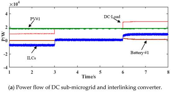 As can be seen from Figure 17a that at the initial moment of the system, the output power of the DC side photovoltaic #1 reaches a maximum value of 18 , and the actual output power of the AC side photovoltaic #2 is lower than the theoretical value, which is about 29 . The sum of the active power of the DC load and the AC load reaches 70 , that is, . So, the DC side battery #1 is droop control. At the same time, the active power deficit exceeds the rated power of AC side battery #2, so battery #2 maintains the rated power output of 10 , and the AC side is still unbalanced. As shown in Figure 17b, about 11 of active power is transmitted from the DC side to the AC side through the interlinking converter. At this time, in order to balance the power balance of the DC sub-microgrid and the AC sub-microgrid, the DC side battery #1 power output is about 14 .