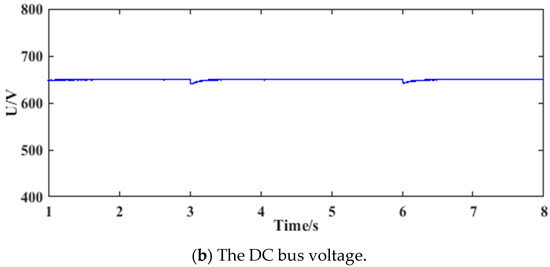 Figure 13b shows the DC bus voltage fluctuations, from which it can be seen that the voltage is stable at the rated value of 650 V at about 0.8 s. Due to the change of system power, there is a slight fluctuation at 2 s, 3 s, and 6 s, but the rated value is quickly restored.