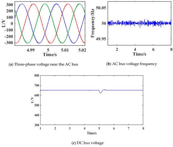 The AC bus voltage and frequency curves are shown in Figure 16a,b, and the DC bus voltage curve is shown in Figure 16c.