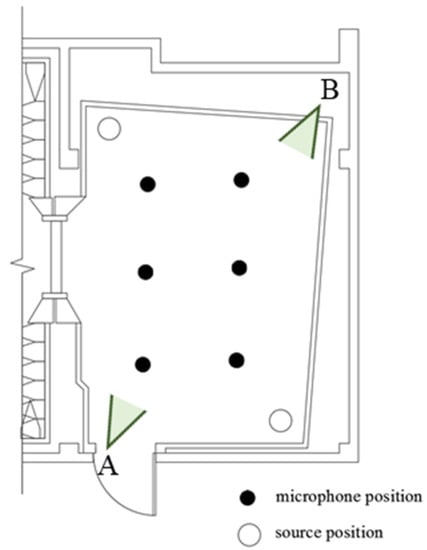 The sound absorption performance of the MEMM was measured in the reverberation room of the architectural acoustics lab at National Cheng Kung University, Taiwan (Figure 2 and Figure 3). The volume of the reverberation room is 171.3 m3, the surface area is 184.3 m2, and the floor area is 32.8 m2. The laboratory uses a floating structure to reduce the outside interference of the experiment. The experiment was based on ISO 354:2003 [11], and the rating of sound absorption was based on ISO 11654 [12]. Measurements were analyzed in 1/3-octave bands with the center frequencies of 125~4000 Hz.