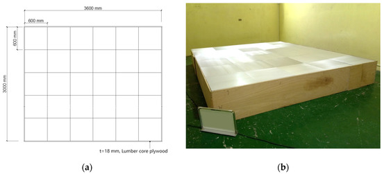 The test specimen is composed of a MEMM and a closed air space layer, which together represent the structure of a common ceiling construction in Taiwan. The total area of the test specimen was 10.8 m2 (3 m × 3.6 m), and each unit was 600 mm × 600 mm, and the 18 mm thick lumber core plywood is used for edge sealing (Figure 4). In the experiment, five kinds of MEMM with different hole distances and panel thicknesses were utilized with different air space depths, as shown in Table 2.