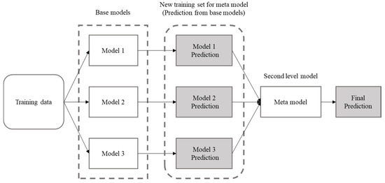 The problem that an averaging method may encounter is that not every model is good, and a bad model will cause the averaged result to be worse. Therefore, the stacking model is an improvement of the average model by assigning weight to the contribution of each model (in the average model, each model contributes the same amount). The specific method uses trainable combiners, which develop a learner (another meta-model) in order to first combine the models. Doing so allows researchers to determine which learners are likely to be successful in which part of the feature space and then combine them accordingly [19]. The prediction results of the first-level model are used as the input variables of the meta-model (Figure 6).
