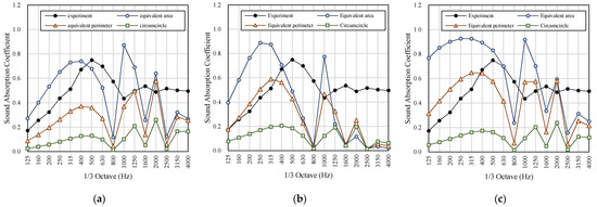 In this study, two prediction models for the perforated panel and one for MPP were adapted for the prediction models of MEMM. Note that in these models, the assumptions of the holes are circular perforations, so the parameters of the geometric conditions of the MEMM have to be transformed to fit the model. Therefore, we adapted the circle diameters and perforation ratio obtained via equivalent area, equivalent perimeter, and the circumcircle on different sides of the panel (Figure 5, Table 3).