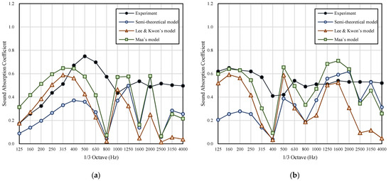 In the first resonance frequency band, the predictive ability of the conventional model was not poor, but regardless of the model, there was several resonance frequency bands (several resonance frequencies), which are not show in the experimental results. The assumptions of the conventional model were all speculated to be ideal physical environments. In the literature, the model was compared with the measurement of impedance tubes to demonstrate the results of several resonance frequency bands [3]. However, the results of this study, whose experiment was conducted in a reverberation room, has no such situation. The measurement method of sound absorption consists of small-size—impedance tubes [20,21] and large-size—reverberation room [11]. Further research is warranted to clarify the difference and connection between the two.