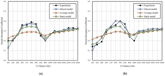The sound absorption coefficient of each frequency band was predicted via the ML process, and the results were then compared with the experiment data to verify the applicability. The root-mean-square error (RMSE) value between the prediction models and experiment data were used to evaluate applicability.