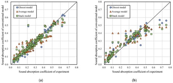 In the machine learning part (Figure 10 and Figure 11), the prediction of the basic linear regression models was poor and failed to express the characteristics of such resonance absorption structure performing better in a specific frequency band (resonance frequency). For the ensemble model, the Gboost model and the stacking model were more accurate. The Gboost and stacking models are shown to express better sound absorption at resonance frequency. Compared to conventional models, ML models had better predictive ability for medium and high frequencies. Nevertheless, the average model could not fit the sound absorption trend. Furthermore, the prediction performance of the training set was better than that of the test set. The nomenclature and prediction results of other cases are attached in Appendix A.