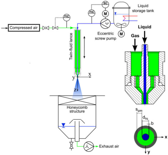 The investigations were conducted using the ATMOspheric spray test rig (ATMO), described in detail in Sänger et al. [14] and shown in Figure 1. For spray characterization, a time-shift and a laser diffraction system, as well as a high-speed camera, were used. A twin-fluid lance was supplied by liquid or suspension fluids through an eccentric screw pump (mass flow range: kg·h) controlled with a Coriolis mass flow and density meter. A stirred liquid storage tank was used to avoid sedimentation. A hot wire anemometer with a valve controlled the atomizing air mass flow in the range of: kg·h. To prevent the recirculation of small droplets through the suction of the exhaust air, a honeycomb structure was placed at the inlet of the collection tank to serve as flow straightener. The twin-fluid atomizer has a central tube with = 2 mm and a surrounding gas slit of = 2.88 mm. The influence of the tube separating the gas and liquid at the nozzle orifice was minimized by reducing the wall thickness to b = 0.1 mm. According to Tian et al. [32], this configuration results in an undisturbed gas flow at the exit of the nozzle. The nozzle has parallel flow channels to enable the comparability of the experimental results with other investigations, for example those of Faragò and Chigier [10] and Zhao et al. [20].