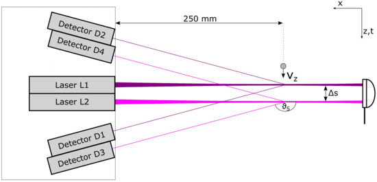 For the local measurement of droplet size and velocity, a so-called SpraySpy® from AOM-Systems was mounted on a 2-D traverse system at z = 150 mm downstream from the nozzle orifice. This measuring position was chosen for two reasons: (i) the secondary breakup is completed at even higher viscosities than those of the investigated liquids, as seen in previous experiments at mPa·s [14]; (ii) the droplets are spherical, as revealed by high-speed camera images and which is also necessary for applicability of the SpraySpy® system. Damaschke et al. [39] described the effect of non-spherical droplets on size measurement using the time-shift technique. The measurement system uses the time of flight method for calculation of droplet velocity and the time-shift method for detection of local droplet diameter [40]. The system was operated in backscatter mode with a working distance of = 250 mm. Two laser beams from laser diodes with wavelengths of = 405 nm and nm each with a constant laser power of about 5 mW, a beam distance of , as well as four detectors in fixed angle of to the measuring plane are mounted, see Figure 2.