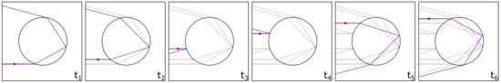 Schematic view of a scattered laser beam exiting a transparent droplet with n = 1.333 at for different times to as a function of droplet velocity . The predominant scattering mode at the presented time step is shown as the thick line.
