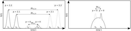 Figure 4 (left) illustrates the signal scattered from a transparent droplet at as peaks over time for one laser beam and two detectors. The different time-shift periods can be detected between the signals p = 2.2 (second order, second mode refractions) as , p = 2.1 (second order, first mode refractions) as and p = 0 (reflections) as . When applying an opaque suspension droplet, the detected signal in can be illustrated as shown in Figure 4 (right). Here, the region of scattered light around the signal peak of the reflection for the respective detector can be attributed to the scattering of the particles within the droplet. The time-shift periods are then reduced to for p = 0. Through a comparison of different redundant time-shift period ratios, a validation can be performed, as described in further detail by Schäfer et al. [40]. Further experiments and simulations concerning the time-shift signal of colloidal suspensions can be found in Li et al. [41].