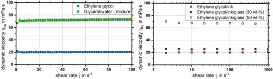 Initially, the flow behavior concerning liquid viscosity and its dependence on the shear rate was investigated. All of the measurements were performed at least twice. As expected, for both liquids (ethylene glycol & the glycerol/water-mixture) a Newtonian flow behavior was detected; see Figure 5 (left). Due to the fact that no segregation effects or particle sedimentation could occur, the increment of the shear rate was set as linear. The dynamic viscosity of ethylene glycol was mPa·s, whereas the glycerol/water-mixture with featured = 70 mPa·s.