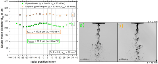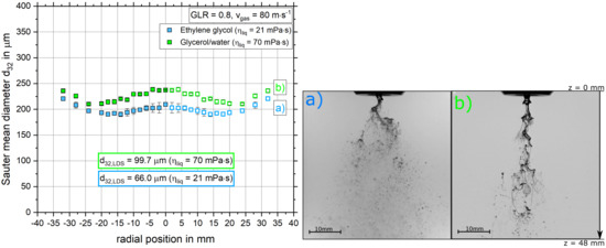Laser diffraction measurements were performed to compare the tendencies observed with the SpraySpy®. The results for both dynamic viscosities are illustrated in Figure 7 (left). In the case of both measurement techniques, the droplet size increases with increasing dynamic viscosity. Here, the LDS detected an increase in droplet size of for increasing viscosity. The difference measured by the SpraySpy® system was between dependent on the radial position, which implies good agreement and a validation of the results attained with the time-shift technique.