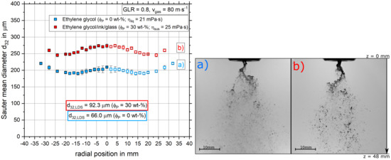 Radial distribution of the Sauter mean diameter at z = 150 mm below the nozzle orifice as a function of the glass mass fraction for m·s (dots: SpraySpy®, values: LDS) (left); High-speed camera images of the primary breakup for m·s at (a) and (b) (right).