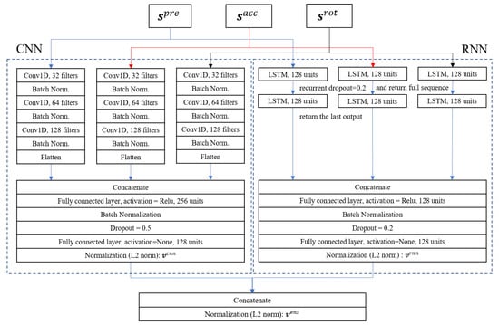 We adapted and upgraded the networks that were used previously [13]. Figure 2 depicts the design of the network architecture. A number of different architectures (including shallower/deeper and narrower/wider) were evaluated and compared, however, their performance differences were neglectable. The original datasets include time series data of pressure, acceleration and rotation. Since the pressure sensors measured the pressure on the same foot during the same walking cycle, we assumed that their values are correlated. Similar assumptions were made for three-dimensional acceleration and rotation values. By considering these correlations, we designed a encoding network model combining CNN and RNN. The proposed network model maps unit steps of pressure , acceleration , and rotation in the standard format to embedding vectors :